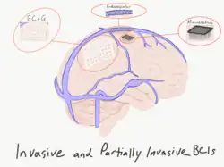 A brain–computer interface (BCI), sometimes called a brain–machine interface (BMI), is a direct communication link between the brain's electrical activity and an external device, most commonly a computer or robotic limb. BCIs are often directed at researching, mapping, assisting, augmenting, or repairing human cognitive or sensory-motor functions.[1] They are often conceptualized as a human–machine interface that skips the intermediary of moving body parts (e.g. hands or feet). BCI implementations range from non-invasive (EEG, MEG, MRI) and partially invasive (ECoG and endovascular) to invasive (microelectrode array), based on how physically close electrodes are to brain tissue.[2]