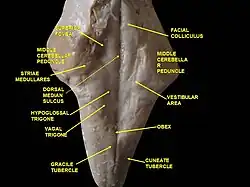 Superior to the obex is the floor of the fourth ventricle. In the floor of the fourth ventricle, various nuclei can be visualized by the small bumps that they make in the overlying tissue. In the midline and directly superior to the obex is the vagal trigone and superior to that it the hypoglossal trigone. Underlying each of these are motor nuclei for the respective cranial nerves. Superior to these trigones are fibers running laterally in both directions. These fibers are known collectively as the striae medullares. Continuing in a rostral direction, the large bumps are called the facial colliculi. Each facial colliculus, contrary to their names, do not contain the facial nerve nuclei. Instead, they have facial nerve axons traversing superficial to underlying abducens (CN VI) nuclei. Lateral to all these bumps previously discussed is an indented line, or sulcus that runs rostrally, and is known as the sulcus limitans. This separates the medial motor neurons from the lateral sensory neurons. Lateral to the sulcus limitans is the area of the vestibular system, which is involved in special sensation. Moving rostrally, the inferior, middle, and superior cerebellar peduncles are found connecting the midbrain to the cerebellum. Directly rostral to the superior cerebellar peduncle, there is the superior medullary velum and then the two trochlear nerves. This marks the end of the pons as the inferior colliculus is directly rostral and marks the caudal midbrain. Middle cerebellar peduncle is located inferior and lateral to the superior cerebellar peduncle, connecting pons to the cerebellum. Likewise, inferior cerebellar peduncle is found connecting the medulla oblongata to the cerebellum.
