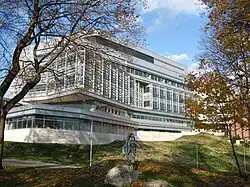 In 1956, Brandeis received a one-million-dollar donation from New York industrialist Jack A. Goldfarb to build a library.[62][63] The building, named the Bertha and Jacob Goldfarb Library in his honor, was designed by Harrison & Abramovitz, a firm which designed many campus buildings in the 1950s.[63] Built of brick and glass, the library was designed to hold 750,000 volumes.[63]