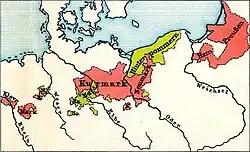 Frederick William's excise tax (Akzise), which since 1667 replaced the property tax raised in Brandenburg for Brandenburg–Prussia's standing army with the estates' consent, was raised by the elector without consultation of the estates.[29] The conclusion of the Second Northern War had strengthened the elector politically, enabling him to reform the constitution of Cleves and Mark in 1660 and 1661 to introduce officials loyal to him and independent of the local estates.[29] In the Duchy of Prussia, he confirmed the traditional privileges of the estates in 1663,[29] but the latter accepted the caveat that these privileges were not to be used to interfere with the exertion of the elector's sovereignty.[30] As in Brandenburg, Frederick William ignored the privilege of the Prussian estates to confirm or veto taxes raised by the elector: while in 1656, an Akzise was raised with the estates' consent, the elector by force collected taxes not approved by the Prussian estates for the first time in 1674.[30] Since 1704, the Prussian estates had de facto relinquished their right to approve the elector's taxes while formally still entitled to do so.[30] In 1682, the elector introduced an Akzise to Pomerania and in 1688 to Magdeburg,[30] while in Cleves and Mark an Akzise was introduced only between 1716 and 1720.[29] Due to Frederick William's reforms, the state income increased threefold during his reign,[31] and the tax burden per subject reached a level twice as high as in France.[61]