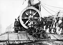 After 1900, due to weathering and environmental damage, smaller and larger pieces of stone began to fall from the gate. Comprehensive renovation work began in 1913, which had to be interrupted by the outbreak of World War I and was not completed until 1926. Meanwhile, the events of the November Revolution had led to further significant damage, particularly to the quadriga. Indeed, the gate was used as a firing position by government troops during both the Spartacist uprising of January 1919 and the Kapp Putsch in March 1920.[19] The restoration work was carried out on site under the direction of Kurt Kluge. For this purpose, the quadriga was encased in a wooden structure. Berliners spoke of the "highest horse stable in Berlin", but regardless of the weather, the work could be carried out in the dry without any delay.[20] The numerous sandstone reliefs were restored and partially renovated under the artistic direction of Wilhelm Wandschneider, who remodeled one of the centaur metopes with a different motif.