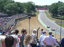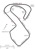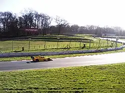 The full Grand Prix circuit begins on the Brabham Straight, an off-camber, slightly curved stretch, before plunging into the right-hander at Paddock Hill Bend, with gradients of 8%.[1] Despite the difficulty of the curve, due to the straight that precedes it, it is one of the track's few overtaking spots. The next corner, Druids, is a hairpin bend, taken after an uphill braking zone at Hailwood Hill. The track then curves around the south bank spectator area into the downhill, off-camber Graham Hill Bend, and another, slightly bent stretch at the Cooper Straight, which runs parallel to the pit lane. After the straight, the circuit climbs uphill though the decreasing-radius Surtees turn, before moving onto the back straight where the track's top speeds can be reached. The most significant elevation changes on the circuit occur here at Pilgrim's Drop and Hawthorn Hill, which leads into Hawthorn Bend (with some parts approaching 7%). The track then loops around the woodland with a series of mid-speed corners, most notably the dip at Westfield and Dingle Dell and the blind Sheene curve. From there the track then emerges from the left hand and cambered Stirlings Bend onto the short straight to Clearways and rejoins the Indy Circuit for Clark Curve with its uphill off-camber approach to the pit straight and the start/finish line.