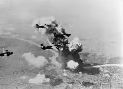 Bratislava, occupied by German troops, was many times bombarded by the Allies. Major air raid included the bombing of Bratislava and its refinery Apollo on June 16, 1944, by American B-24 bombers of the Fifteenth Air Force with 181 victims[83] Bombardment group attacked in four waves with overall 158 planes. On April 4, 1945, Bratislava was liberated by the Soviet Red Army 2nd Ukrainian Front during the Bratislava–Brno offensive.[78][84] The Czechoslovak government and president Edvard Beneš then moved to Bratislava on May 8.[85]