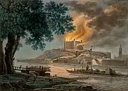 The city's 19th-century history was closely tied to the major events in Europe. The Peace of Pressburg between the Austrian Empire and French Empire was signed here in 1805.[58] Devín Castle was ruined by Napoleon's French troops during an invasion of 1809.[59] In 1825, the Hungarian National Learned Society (the present Hungarian Academy of Sciences) was founded in Pressburg using a donation from István Széchenyi. In 1843, Hungarian was proclaimed the official language in legislation, public administration, and education by the Diet in the city.[60]