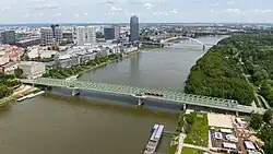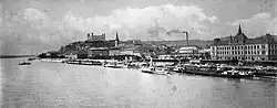 Industry developed rapidly in the 19th century. The first horse-drawn railway in the Kingdom of Hungary,[63] from Pressburg to Szentgyörgy (Svätý Jur), was built in 1840.[64] A new line to Vienna using steam locomotives was opened in 1848, and a line to Pest in 1850.[65] Many new industrial, financial, and other institutions were founded; for example, the first bank in present-day Slovakia was founded in 1842.[66] The city's first permanent bridge over the Danube, Starý most (Old Bridge), was built in 1891.[67] Between the years 1867-1918, the territory of Pressburg became part of Austro-Hungarian Empire.
