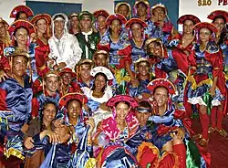The first inhabitants of what would become Brazil were people whose ancestry can be traced back to Asian populations that crossed the Bering Strait, passing from Siberia to the Americas.[9][10][11][12] There are indications of the presence of indigenous peoples in the current Brazilian territory dating from 16,000 BC in Lagoa Santa, from 14,200 BC in Rio Claro and from 12,770 BC in Ibicuí (Rio Grande do Sul). Estimates of the number of Native Americans that were living in present-day Brazil in 1500 vary between 1 and 5 million.[13][14][15] They were divided into two major language families: Macro-Jê and Macro-Tupi. With the arrival of the Portuguese in present-day Brazil, in 1500, a significant part of the indigenous population perished, mainly due to contamination by Eurasian diseases to which the Indians had no biological immunity, such as smallpox, measles, yellow fever or flu. In most cases, these contaminations were involuntary; however, there are also reports of intentional infection.[13] Despite this, millions of Brazilians have indigenous ancestry. In Brazilian history, the practice of "cunhadismo" was very common; it was an ancient indigenous practice of incorporating strangers into their community, through the delivery of indigenous girls as wives. In this context, many Portuguese settlers had relationships with indigenous women, whose descendants make up a large part of the current Brazilian population.[16][17][18]