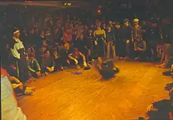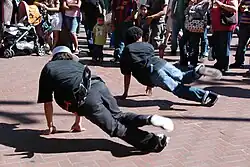 Breakdancing consists mainly of four kinds of movement—toprock, footwork, power moves, and freezes—and is typically set to songs containing drum breaks, especially in funk, soul, and hip-hop. Its modern dance elements originated among the poor youth of New York during the 1970s and early 1980s.[5] It is tied to the birth of hip-hop, whose DJs played songs featuring rhythmic breaks for dancers.[6]
