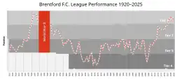 Brentford played in the top division of English football for the first time in 74 years.[68] Frank guided his side to 13th, 9th, 16th and 10th-placed finishes in Brentford's first four Premier League campaigns,[31] before eventually leaving the club in June 2025 to manage Tottenham Hotspur.[83] Keith Andrews was eventually announced as his successor later that month.[84]