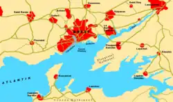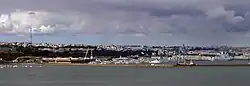 Brest (French pronunciation: [bʁɛst] ⓘ;[3] Breton: [bʀest] ⓘ[4]) is a port city in the Finistère department, Brittany. Located in a sheltered bay not far from the western tip of a peninsula and the western extremity of metropolitan France,[5] Brest is an important harbour and the second largest French military port after Toulon. The city is located on the western edge of continental France. With 139,456 inhabitants (2020),[6] Brest forms Western Brittany's largest metropolitan area (with a population of 370,000 in total), ranking third behind only Nantes and Rennes in the whole of historic Brittany, and the 25th most populous city in France (2019); moreover, Brest provides services to the one million inhabitants of Western Brittany.[7] Although Brest is by far the largest city in Finistère, the préfecture (administrative seat) of the department is in the much smaller town of Quimper.