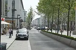 Monumental perspective from the Place de la Liberté opening to the rue de Siam (Siam Street), with the rade de Brest (Brest roadstead) in the background, and on the right, the steeple of Saint-Louis church dominating the rebuilt centre of Brest