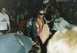 Hart's three-year contract with World Championship Wrestling (WCW) included a salary of $2.5 million per year (a $1 million annual increase from his WWF contract), as well as a light schedule and a measure of creative control over his television character.[135] A day after the WWF's Survivor Series pay-per-view, Eric Bischoff, while with the New World Order (nWo), announced that Hart was going to be coming to WCW and joining the nWo. Hart made his debut on Nitro on December 15, 1997.[136] He was also heavily involved in that month's Starrcade pay-per-view. Due to a 60-day no-compete clause from the WWF, he served as the special guest referee for the match between Bischoff and Larry Zbyszko; during the Sting versus Hollywood Hogan main event for the WCW World Heavyweight Championship, he stepped in toward the conclusion of the match as impromptu referee, declaring Sting the winner and new champion by submission, establishing Hart as a face in the process.[137][138] In January, his no-compete clause expired, and his first feud in WCW was against Ric Flair, as both wrestlers considered themselves the greatest professional wrestlers of all time. Hart defeated Flair at Souled Out in his first WCW match.[139] After this, Hart elected to defend the honour of WCW against the nWo, defeating members Brian Adams in his debut Nitro match on March 2, and Curt Hennig at Uncensored.[140] In April 1998, Hart interfered in a Nitro main event between Hollywood Hogan and Randy Savage, helping Hogan recapture the WCW World Heavyweight Championship, turning heel in the process. He became an associate of the nWo, but did not officially join the group.