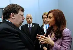 Brian Bernard Cowen (born 10 January 1960) is an Irish former politician who served as Taoiseach and Leader of Fianna Fáil from 2008 to 2011. Cowen served as a TD for the constituency of Laois–Offaly from 1984 to 2011 and served in several ministerial roles between 1992 and 2011, including as Minister for Finance from 2004 to 2008 and Tánaiste from 2007 to 2008.[1]