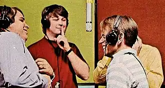 During sessions for Wild Honey (December 1967), Wilson encouraged his brother Carl to contribute more to the record-making process.[142] He also began producing tracks for Danny Hutton's group Redwood, recording three songs including "Time to Get Alone" and "Darlin'", but the project was halted by Carl and Mike Love, who urged Brian to prioritize Beach Boys commitments.[165] The band's June 1968 album Friends was recorded during a period of emotional recovery for Wilson.[166] While the album featured increased contributions from other members, Wilson remained central, even on tracks he did not write.[167] He later described Friends as his second "solo album" (after Pet Sounds)[168] and his favorite Beach Boys album.[169][166]