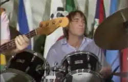 Beginning on July 2, 1976, Wilson resumed regular performances with the band for the first time since 1964, singing and alternating between bass guitar and piano.[247][248][nb 21] In August, he toured outside California for the first time since 1970.[249] NBC premiered a Lorne Michaels–produced television special, titled The Beach Boys, featuring recent concert footage, interviews, and a comedy sketch with Wilson alongside NBC's Saturday Night cast members Dan Aykroyd and John Belushi.[250][nb 22] Despite the promotional success of "Brian's Back!", the campaign was controversial. Wilson's remarks in interviews implied he had not fully recovered from his addictions; on one occasion, he remarked that he "felt like a prisoner".[229] A concert reviewer noted that he "seemed uncomfortable on stage" and contributed "nil".[252]