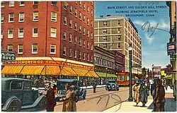 As cities across the country were renovating their central business district after the war, Bridgeport attempted its own urban renewal projects in its old downtown in the early 1960s during the construction of the highways. Hunktown, with a population of 15,000 and the Irish neighborhood in the South End were demolished and replaced with highways and an industrial park. The Trumbull Shopping Park was built just outside Bridgeport city limits in Trumbull in 1965, Connecticut's first fully enclosed shopping mall.[88][89] Bridgeport under Mayor Tedesco went under the 52-acre (21 ha) State Street redevelopment project,[90] demolishing 52 acres of State Street, clearing the land for development. Replaced with modern high-rise office buildings, parking, the Route 8/25 expressway towards Waterbury and Newtown, and a shopping mall at its core.[91] Large parts of Main Street were demolished in what was called the Congress Street Renewal project, nothing was built on the land. Constructed with federal funding, on Lafayette Boulevard and Broad Street, the 450,000 acre, 2 story (with basement) Lafayette Shopping Plaza was erected, a downtown shopping mall with a Sears and a Gimbels department store as anchors connected to it. Military contracts during the 1950s and 1960s enabled the Bridgeport-Lycoming division of AVCO, founded 1951, to employ at times more than 12,000 people, building tanks, helicopters, and other military hardware. Decreased demand led to layoffs, and then closure in 1984.[92] Other examples of urban development include two city landmarks, the 12-story 855 Main Street (People's Savings Bank building), and 18-floor Park City Plaza, (State National Bank building) built 1972. The plan for three identical towers never materialized, due to the Oil Crisis and corporate vacancies.