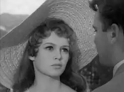 At the audition, Bardot met Roger Vadim, who later notified her that she did not get the role.[35] They subsequently fell in love.[36] Her parents fiercely opposed their relationship; her father announced to her one evening that she would continue her education in England and that he had bought her a train ticket for the following day.[37] Bardot reacted by putting her head into an oven with open fire; her parents stopped her and ultimately accepted the relationship, on condition that she marry Vadim at the age of 18.[38]