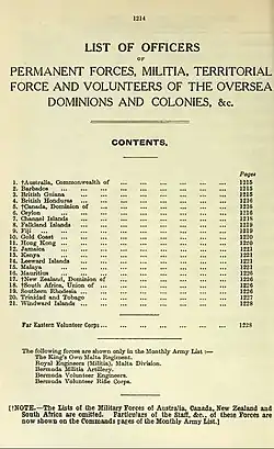 - ^ HART'S ANNUAL ARMY LIST, SPECIAL RESERVE LIST, AND TERRITORIAL FORCE LIST, FOR 1911: (BEING THE SEVENTY-SECOND ANNUAL VOLUME,) CONTAINING DATES OF COMMISSIONS, AND A SUMMARY OF THE WAR SERVICES OF NEARLY EVERY OFFICER IN THE ARMY, SUPPLY &c. DEPARTMENTS, MARINES, AND INDIAN ARMY, AND INDIAN LOCAL FORCES. WITH AN INDEX. BY THE LATE LIEUTENANT GENERAL H. G. HART. JOHN MURRAY, ALBEMARLE STREET, LONDON. 1911