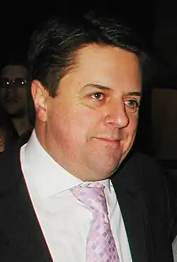 After the BNP's poor performance at the 1997 general election, opposition to Tyndall's leadership grew.[56] The modernisers called the party's first leadership election, and in October 1999 Tyndall was ousted when two-thirds of those voting backed Nick Griffin, who offered an improved administration, financial transparency, and greater support for local branches.[58] Often characterised as a political chameleon,[59] Griffin had once been considered a party hardliner before switching allegiance to the modernisers in the late 1990s. In his youth, he had been involved in the NF as well as Third Positionist groups like Political Soldier and the International Third Position.[60] Criticising his predecessors for fuelling the image of the BNP as "thugs, losers and troublemakers",[61] Griffin inaugurated a period of change in the party.[62]