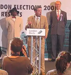In a 2011 leadership election, Griffin secured a narrow victory, beating Brons by nine votes of a total of 2,316 votes cast.[104] In October 2012, Brons left the party, leaving Griffin as its sole MEP.[105] In the 2012 local elections, the party lost all of its seats and saw its vote share fall dramatically; whereas it gained over 240,000 votes in 2008, this had fallen to under 26,000 by 2012.[106] Commenting on the result, the political scientist Matthew Goodwin noted: "Put simply, the BNP's electoral challenge is over."[107] In the 2012 London mayoral election, the BNP candidate came seventh, with 1.3% of first-preference votes, its poorest showing in the London mayoral contest.[108] The 2012 election results established that the BNP's steady growth had ended.[109] In the 2013 local elections, the BNP fielded 99 candidates but failed to win any council seats, leaving it with only two.[110]