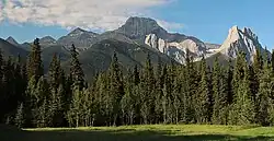 Principal photography began on May 25, 2004.[33][34] While the Proulx story is set in Wyoming, Brokeback Mountain was filmed almost entirely in the Canadian Rockies in southern Alberta. Lee was given a tour of the locations from the story in Wyoming by Proulx, but chose to shoot in Alberta citing financial reasons.[19] The mountain featured in the film is a composite of Mount Lougheed south of the town of Canmore, Fortress and Moose Mountain in Kananaskis Country.[35] The campsites were filmed at Goat Creek, Upper Kananaskis Lake, Elbow Falls and Canyon Creek, also in Alberta. Other scenes were filmed in Cowley, Fort Macleod, and Calgary.[36] Brokeback Mountain's production budget was approximately US$14 million.[37]