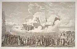 On 7 August 1782, fourteen years after excavation of the pedestal began, the finished statue was unveiled in a ceremony with thousands in attendance. Conspicuously absent was Falconet, as a misunderstanding between him and the empress turned into a serious conflict. As a result, he was forced to leave Russia four years before the project was completed. Catherine largely forgot about him afterwards, and came to see the Bronze Horseman as her own oeuvre.[3]