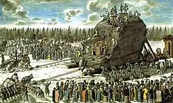Carburis directed workmen to wait for winter, when the ground was frozen, and then had them drag the large stone over the frozen ground to the sea for shipment and transport to the city. He developed a metallic sled that slid over bronze spheres about 13.5 cm (6 inches) in diameter, over a track. The process worked in a way similar to ball bearings. Making the feat even more impressive was that the labour was done entirely by humans; no animals or machines were used in bringing the stone from the original site to the Senate Square.[8] After Carburis devised the method, it took 400 men nine months to move the stone, during which time master stonecutters continuously shaped the enormous granite monolith.[3] Catherine periodically visited the effort to oversee their progress. The larger capstan was turned by 32 men, this just barely moving the rock. A further complication was the availability of only 100 m of track, which had to be constantly disassembled and relaid.[8] Nevertheless, the workers made over 150 m of progress a day while on level ground. Upon arrival at the sea an enormous barge was constructed exclusively for the Thunder Stone. The vessel had to be supported on either side by two full-size warships.[8] After a short voyage, the stone reached its destination in 1770, after nearly two years of work. A medal was issued to commemorate its arrival, with the legend "Close to Daring".[7]