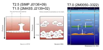 For late T-type brown dwarfs only a few variable searches were carried out. Thin cloud layers are predicted to form in late T-dwarfs from chromium and potassium chloride, as well as several sulfides. These sulfides are manganese sulfide, sodium sulfide and zinc sulfide.[44] The variable T7 dwarf 2M0050–3322 is explained to have a top layer of potassium chloride clouds, a mid layer of sodium sulfide clouds and a lower layer of manganese sulfide clouds. Patchy clouds of the top two cloud layers could explain why the methane and water vapor bands are variable.[45]