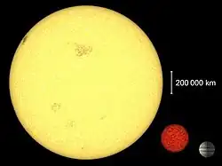 Comparison: most brown dwarfs are slightly larger in volume than Jupiter (15–20%),[1] but are still up to 80 times more massive due to greater density. Image is to scale, with Jupiter's radius being 11 times that of Earth, and the Sun's radius 10 times that of Jupiter.