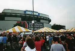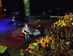 Springsteen was inducted into the Rock and Roll Hall of Fame in 1999 by Bono (the lead singer of U2), a favor he returned in 2005.[132] In 1999, Springsteen and the E Street Band reunited and began their extensive Reunion Tour, which lasted over a year. Highlights included a record sold-out, 15-show run at Continental Airlines Arena in East Rutherford, New Jersey and a ten-night, sold-out engagement at New York City's Madison Square Garden. A new song played at these shows, "American Skin (41 Shots)" (about the police shooting of Amadou Diallo), proved controversial.[133]