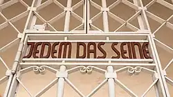 On the camp's main gate, the motto Jedem das Seine (English: "To each what he deserves"), was inscribed. The SS interpreted this to mean the "master race" had a right to humiliate and destroy others.[9] It was designed by Buchenwald prisoner and Bauhaus architect Franz Ehrlich, who used a Bauhaus typeface for it, even though Bauhaus was seen as degenerate art by the National Socialists and was prohibited. This defiance however went unnoticed by the SS.[10]