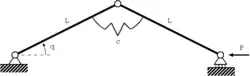 Using the concept of total potential energy, , it is possible to identify four fundamental forms of buckling found in structural models with one degree of freedom. We start by expressing where is the strain energy stored in the structure, is the applied conservative load and is the distance moved by in its direction. Using the axioms of elastic instability theory, namely that equilibrium is any point where is stationary with respect to the coordinate measuring the degree(s) of freedom and that these points are only stable if is a local minimum and unstable if otherwise (e.g. maximum or a point of inflection).[8]