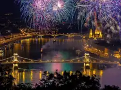 Skyline with the Chain Bridge (in the background), the Elisabeth Bridge, Banks of Danube and Downtown of Pest from Gellért Hill Hungarian Parliament Széchenyi Thermal Bath Opera House on Andrássy Avenue Fisherman's Bastion with Matthias Church Great Market Hall on Váci Street Infopark science and business district Margaret Island and Margaret Bridge | |