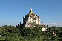 Anawrahta banished many Ari priests who refused to conform and many of them fled to Popa Hill and the Shan Hills.[34] Anawrahta also invited Theravāda scholars from the Mon lands, Sri Lanka and India to Bagan. Their scholarship helped revitalize a more orthodox form of Theravāda Buddhism, with a focus on Pali learning and Abhidhamma philosophy.[35] Anawrahta is also known as a great temple builder. Some of his main achievements include the Shwezigon Pagoda and the Shwesandaw Pagoda.[36]