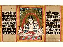 The Mahāsāṃghika and the Mūlasarvāstivāda considered both the Buddha's discourses and those of his disciples to be buddhavacana.[10] A number of different beings such as Buddhas, disciples of the Buddha, ṛṣis, and devas were considered capable of transmitting buddhavacana.[10] According to early Buddhist sources like the Mahāpadesasutta, a text said by someone other than the Buddha may be certified as true buddhavacana by four "great references to authority" (mahāpadeśa): (1) the buddha himself (who often certified the statements of others as buddhavacana in the sutras), (2) a sangha of wise elders, (3) a small group of specialist monks (dharmadharas or vinayadharas), or (4) one elder knowledgeable in the Dharma.[12][13][14] The content of such a discourse was then to be collated with the sūtras, compared with the Vinaya, and evaluated against the nature of the Dharma.[12][13] This allowed a certain flexibility in the compilation of the Buddhist canons, which were not necessarily closed after the Buddha's death.[14]