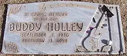 Holly's funeral was held on February 7, 1959, at the Tabernacle Baptist Church in Lubbock. The service was officiated by Ben D. Johnson, who had presided at the Hollys' wedding just months earlier. The pallbearers were Jerry Allison, Joe B. Mauldin, Niki Sullivan, Bob Montgomery, and Sonny Curtis. Some sources say that Phil Everly, one half of The Everly Brothers, was also pallbearer, but Everly said that he attended the funeral but was not a pallbearer.[58] Waylon Jennings was unable to attend because of his commitment to the still-touring Winter Dance Party. Holly's body was interred in the City of Lubbock Cemetery, in the eastern part of the city. Holly's headstone carries the correct spelling of his surname (Holley) and a carving of his Fender Stratocaster guitar.[59]