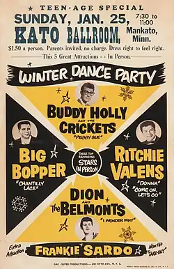 The Winter Dance Party tour began in Milwaukee, Wisconsin, on January 23, 1959. The amount of travel involved created logistical problems, as the distance between venues had not been considered when scheduling performances. Adding to the problem, the unheated tour buses twice broke down in freezing weather, with dire consequences. Holly's drummer, Carl Bunch, was hospitalized for frostbite to his toes (sustained while aboard the bus), so Holly decided to seek other transportation.[53] On February 2, before their appearance in Clear Lake, Iowa, Holly chartered a four-seat Beechcraft Bonanza airplane for Jennings, Allsup, and himself, from Dwyer Flying Service in Mason City, Iowa. Holly's idea was to depart following the show at the Surf Ballroom in Clear Lake and fly to their next venue, in Moorhead, Minnesota, via Fargo, North Dakota, allowing them time to rest and launder their clothes and avoid an arduous bus journey. Immediately after the Clear Lake show (which ended just before midnight), Allsup agreed to flip a coin for the seat with Ritchie Valens. Valens called heads; when he won, he reportedly said, "That's the first time I've ever won anything in my life." Allsup later opened a restaurant/bar in Fort Worth, Texas, called Heads Up Saloon.[54] Waylon Jennings voluntarily gave up his seat to J. P. Richardson (the Big Bopper), who had influenza and complained that the tour bus was too cold and uncomfortable for a man of his size.[55]