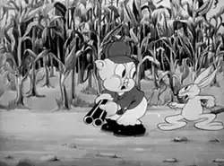 According to Chase Craig, who wrote and drew the first Bugs Bunny comic Sunday pages and the first Bugs comic book, "Bugs was not the creation of any one man; however, he rather represented the creative talents of perhaps five or six directors and many cartoon writers including Charlie Thorson.[9] In those days, the stories were often the work of a group who suggested various gags, bounced them around and finalized them in a joint story conference."[10] A prototype Bugs rabbit with some of the personality of a finalized Bugs, though looking very different, was originally featured in the film Porky's Hare Hunt, released on April 30, 1938. It was co-directed by Ben "Bugs" Hardaway and an uncredited director Cal Dalton (who was responsible for the initial design of the rabbit). This cartoon has an almost identical plot to Avery's Porky's Duck Hunt (1937), which had introduced Daffy Duck. Porky Pig is again cast as a hunter tracking a silly prey who is more interested in driving his pursuer insane and less interested in escaping. Hare Hunt replaces the little black duck with a small white rabbit. According to Friz Freleng, Hardaway and Dalton had decided to "dress the duck in a rabbit suit".[11] The white rabbit had an oval head and a shapeless body. In characterization, he was "a rural buffoon". Mel Blanc gave the character a voice and laugh much like those he later used for Woody Woodpecker. He was loud, zany with a goofy, guttural laugh.[12] The rabbit character was popular enough with audiences that the Termite Terrace staff decided to use it again.[13]