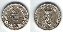 Between 1881 and 1884, bronze 2, 5, and 20 stotinki, and silver 50 stotinki, 1, 2, and 5 leva were introduced, followed, in 1888, by cupro-nickel 2+1⁄2, 5, 10, and 20 stotinki. Gold 10 and 20 leva were issued in 1894. Bronze 1 stotinka were introduced in 1901.