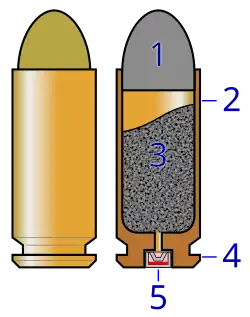 The term bullet is from Early French, originating as the diminutive of the word boulle (boullet), which means "small ball".[3] Bullets are available singly (as in muzzle-loading and cap and ball firearms)[4] but are more often packaged with propellant as a cartridge ("round" of ammunition) consisting of the bullet (i.e., the projectile),[5] the case (which holds everything together), the propellant (which provides the majority of the energy to launch the projectile), and the primer (which ignites the propellant). Cartridges, in turn, may be held in a magazine, a clip, or a belt (for rapid-fire automatic firearms). Although the word bullet is often used in colloquial language to refer to a cartridge round, a bullet is not a cartridge but rather a component of one.[6] This use of the term bullet (when intending to describe a cartridge) often leads to confusion when a cartridge and all its components are specifically being referenced.