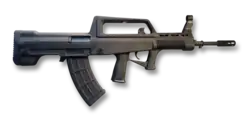 The Steyr AUG (selected in 1977) is often cited as the first successful bullpup,[17][18][19] in service with the armed forces of over twenty countries, and the primary rifle of Austria and Australia. It was highly advanced for the 1970s, combining in the same weapon the bullpup configuration, extensive use of polymer, dual vertical grips, an optical sight as standard, and a modular design. Highly reliable, light, and accurate, the Steyr AUG showed clearly the potential of the bullpup layout. The arrival of the FAMAS in 1978, and its adoption by France emphasized the slide from traditional to bullpup layouts within rifle designs.[19]