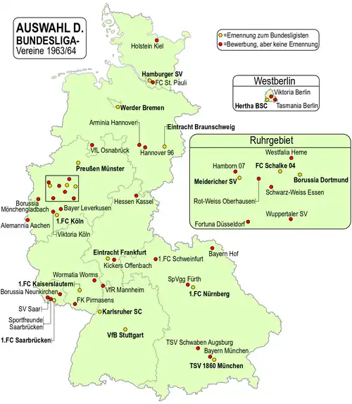 At the time, there were five Oberligen (premier leagues) in place representing West Germany's North, South, West, Southwest, and Berlin. East Germany, behind the Iron Curtain, maintained its separate league structure. 46 clubs applied for admission to the new league. 16 teams were selected based on their success on the field, economic criteria and representation of the various Oberligen.