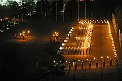 One of the most visible traditions of the modern Bundeswehr is the Großer Zapfenstreich. This is a form of military tattoo that has its origins in the landsknecht era. The FRG reinstated this formal military ceremony in 1952, three years before the foundation of the Bundeswehr. Today it is performed by a military band with 4 fanfare trumpeters and timpani, a corps of drums, up to two escort companies of the Bundeswehr's Wachbataillon (or another deputized unit) and torchbearers. The Zapfenstreich is only performed during national celebrations or solemn public commemorations. It can honour distinguished persons present such as the German Federal President, or provide the conclusion to large military exercises.