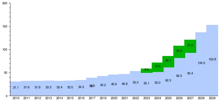 In 2025, the new government under Chancellor Friedrich Merz passed laws to further significantly expand the Bundeswehr, both in materiel and personnel. The annual military budget of Germany is to grow from ~2% of its GDP in 2025 to 3.5% in 2029.[55] A new push to gain more volunteers and mechanisms for compulsory drafting in case these efforts are insufficient ("Nordic model") have been announced to come into force on January 1, 2026. The goal is to reach a number of 260,000 of active Bundeswehr personnel, a 30% increase from its 2025 number.[56]