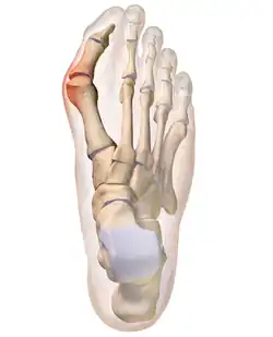A bunion, also known as hallux valgus, is an outward deformity of the foot's metatarsophalangeal joint which connects the big toe to the foot.[2] The rear tarsametatarsal joint that holds the metatarsal bone in a straight-ahead position weakens, and the metatarsal moves outward and rotates 90 degrees, bringing the sesamoids up against the adjacent toe. This results in the head of the metatarsal bulging outward while the big toe bends inward toward the other toes. The joint often becomes red and painful due to rubbing in a cramped shoe.[2] The onset of bunions is typically gradual.[2] Joint complications may include bursitis or arthritis.[2] A similar condition of the little toe is referred to as a bunionette.[2]
