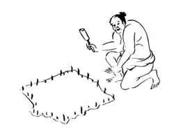 The origins of buraku discrimination are connected to status distinctions that existed in Japan from the pre-modern era.[14] During the Yamatai state (c. 1st–3rd century CE), a class structure composed of royalty, nobles, commoners, and slaves existed, with clear status distinctions.[15] However, the direct institutional precursor to the buraku outcaste system was the senmin (賤民, "base/lowly people") system established under the Ritsuryō legal codes in the late 7th and early 8th centuries.[16] Influenced by Chinese legal structures, the Ritsuryō system divided the population into ryōmin (良民, "good people") and senmin. The senmin class included various groups, such as imperial tomb guards (kanko) and government- or privately-owned slaves (nuhi).[17] This system made slavery hereditary, forbade intermarriage with ryōmin, and connected the notion of "baseness" with the polluting nature of death, as tomb guards were re-assigned to senmin status.[18]