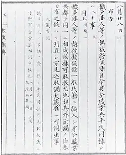 However, the edict did not end social discrimination. While the former outcastes largely responded with elation, demanding equal rights and in some cases engaging in self-policing to become more acceptable to the majority, many commoners reacted with hostility, seeing the reform not as an elevation of the burakumin but as a demotion for themselves that violated the traditional "moral economy".[52] Violent riots occurred in opposition to the edict, often linked to broader discontent with Meiji modernization policies like conscription and land tax reform.[53] These included "eta hunts" (eta-gari) and the destruction of buraku homes and property.[54] In June 1873, a major rebellion in Fukuoka Prefecture known as the Takeyari Ikki involved up to 300,000 people and resulted in the destruction of over 2,000 houses belonging to "new commoners", including the near-total destruction of the Horiguchi community in Hakata.[4] The abolition of their traditional occupations, which had been guaranteed monopolies, was a double-edged sword: while it removed hereditary bonds to certain jobs, it also thrust many into economic difficulty as they were forced to compete with other entrepreneurs without state support.[55][56][57] Discrimination was enabled through the koseki (family registry) system, which marked former outcastes as "new commoners", allowing their ancestry to be easily traced and perpetuating barriers to social integration.[58]