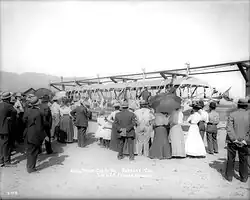 The arrival of the Southern Pacific Railroad in 1876, linking San Francisco and Los Angeles, marked a turning point for the San Fernando Valley, including what would become Burbank. A shrewd businessman, Dr. Burbank sold a 100-foot-wide (30 m), nearly three-mile-long (4.8 km) right-of-way to the railroad.[17] This decision helped shape Burbank’s future, positioning it as a vital transportation and commerce hub within the Valley.[18] The first train passed through Burbank on April 5, 1874. A boom created by a rate war between the Santa Fe and Southern Pacific brought people streaming into California. By 1886, a group of speculators had purchased much of Burbank's land holdings for $250,000, possibly due to a severe drought that had made it challenging to sustain his livestock, killing approximately 1,000 sheep due to the lack of water and grass that year.[19]