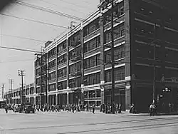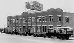 In 1887, the Burbank Furniture Manufacturing Company was the town's first factory.[44] In 1917, the arrival of the Moreland Motor Truck Company changed the town and resulted in growing a manufacturing and industrial workforce. Within a few years, Moreland trucks were seen bearing the label, "Made in Burbank."[45] Watt Moreland, its owner, had relocated his plant to Burbank from Los Angeles. He selected 25 acres (100,000 m2) at San Fernando Blvd. and Alameda Avenue. Moreland invested $1 million in the factory and machinery and employed 500 people. It was the largest truck maker west of the Mississippi.