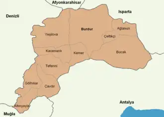 Burdur Province (Turkish: Burdur ili) is a province of Turkey, located in the southwest and bordering Muğla and Antalya to the south, Denizli to the west, Afyon to the north, and Isparta to the east. Its area is 7,175 km2,[2] and its population is 273,799 (2022).[1] The provincial capital is Burdur city.
