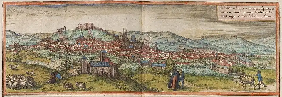 Founded in 885 by the second Count of Castile, Diego Rodríguez Porcelos, Burgos soon became the leading city of the embryonic County of Castile.[5] The 11th century chieftain Rodrigo Díaz de Vivar (El Cid) had connections with the city: born near Burgos, he was raised and educated there. Burgos experienced a long decline from the 17th century onwards.[6]